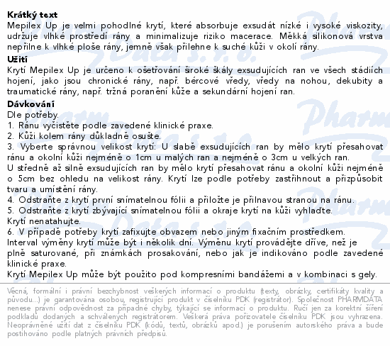 Mepilex Up je velmi pohodlné krytí, které absorbuje exsudát nízké i vysoké viskozity, udržuje vlhké prostředí rány a minimalizuje riziko macerace. Měkká silikonová vrstva nepřilne k vlhké ploše rány, jemně však přilehne k suché kůži v okolí rány.