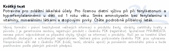 Potravina pro zvláštní lékařské účely. Pro řízenou dietní výživu při při fenylketonurii a hyperfenylalaninémii u dětí od 1 roku věku. Směs aminokyselin bez fenylalaninu s vitamíny, minerálními látkami a stopovými prvky. Čtěte pozorně příbalový leták.