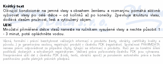 Oživující kondicionér na jemné vlasy s obsahem ženšenu a rozmarýnu pomáhá aktivně vyživovat vlasy po celé délce – od kořínků až po konečky. Zpevňuje strukturu vlasu, dodává vlasům pružnost, lesk a vytoužený objem.