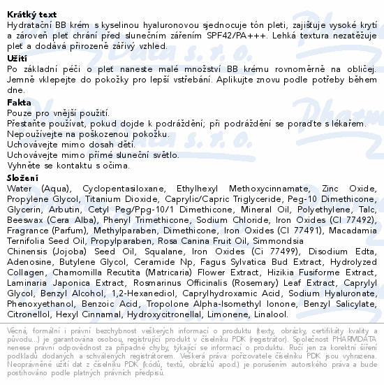 Hydratační BB krém s kyselinou hyaluronovou sjednocuje tón pleti, zajišťuje vysoké krytí a zároveň pleť chrání před slunečním zářením SPF42
