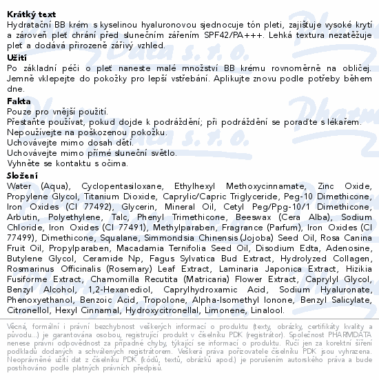 Hydratační BB krém s kyselinou hyaluronovou sjednocuje tón pleti, zajišťuje vysoké krytí a zároveň pleť chrání před slunečním zářením SPF42