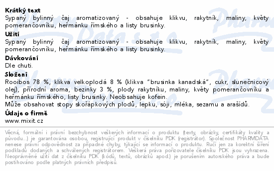 Sypaný bylinný čaj aromatizovaný - obsahuje klikvu, rakytník, maliny, květy pomerančovníku, heřmánku římského a listy brusinky.