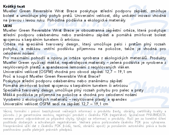 Mueller Green Reversible Wrist Brace poskytuje střední podporu zápěstí, zmírňuje bolest a umožňuje plný pohyb prstů. Univerzální velikost, díky unikátní inovaci vhodná na pravou i levou ruku. Pohodlná podšívka a ekologické materiály.