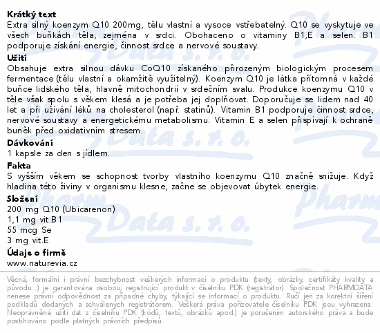 Extra silný koenzym Q10 200mg, tělu vlastní a vysoce vstřebatelný. Q10 se vyskytuje ve všech buňkách těla, zejména v srdci. Obohaceno o vitaminy B1, E a selen. B1 podporuje získání energie, činnost srdce a nervové soustavy.