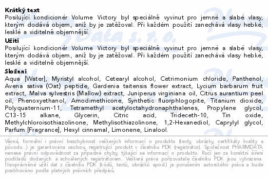 Posilující kondicionér Volume Victory byl speciálně vyvinut pro jemné a slabé vlasy, kterým dodává objem, aniž by je zatěžoval. Při každém použití zanechává vlasy hebké, lesklé a viditelně objemnější.