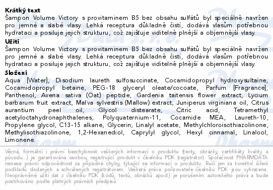 Šampon Volume Victory s provitaminem B5 bez obsahu sulfátů byl speciálně navržen pro jemné a slabé vlasy. Lehká receptura důkladně čistí, dodává vlasům potřebnou hydrataci a posiluje jejich strukturu, což zajišťuje viditelně plnější a objemnější vlasy.