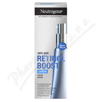 Neutrogena Retinol Boost sérum proti stárnutí pleti s čistým retinolem a s kyselinou hyaluronovou zjemňuje vrásky kolem očí, na čele a tvářích.