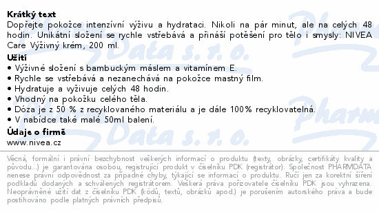 Dopřejte pokožce intenzívní výživu a hydrataci. Nikoli na pár minut, ale na celých 48 hodin. Unikátní složení se rychle vstřebává a přináší potěšení pro tělo i smysly: NIVEA Care Výživný krém, 200 ml.