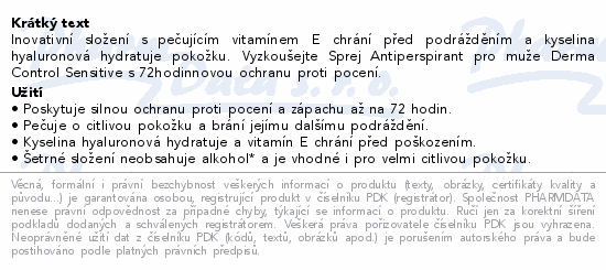 Inovativní složení s pečujícím vitamínem E chrání před podrážděním a kyselina hyaluronová hydratuje pokožku. Vyzkoušejte Sprej Antiperspirant pro muže Derma Control Sensitive s 72hodinnovou ochranu proti pocení.