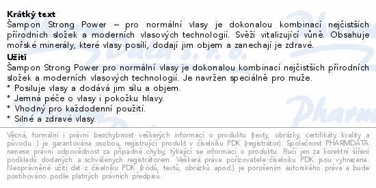 Šampon Strong Power – pro normální vlasy je dokonalou kombinací nejčistších přírodních složek a moderních vlasových technologií. Svěží vitalizující vůně. Obsahuje mořské minerály, které vlasy posílí, dodají jim objem a zanechají je zdravé.