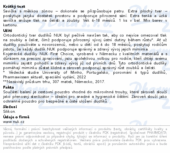 Savička s měkkou zónou – dokonale se přizpůsobuje patru. Extra plochý tvar – poskytuje jazyku dostatek prostoru a podporuje přirozené sání. Extra tenká a úzká savička snižuje tlak na čelisti a zoubky. Věk 6-18 měsíců. 1 ks v bal. Mix barev v kartonu.