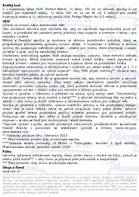2 x kojenecká láhev NUK Perfect Match, 1x láhev 150 ml ve velikosti savičky S od 0 měsíců pro mateřské mléko, 1x láhev 260 ml ve vel. M od 3 měsíců pro umělé kojenecké mléko a 1Ă— silikonový dudlík NUK Perfect Match Air 0-2 měsíců.
