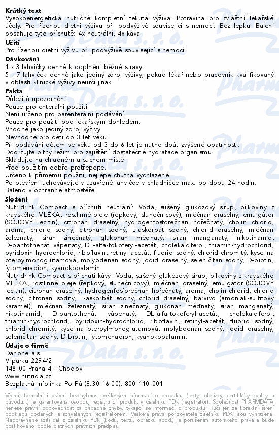 Vysokoenergetická nutričně kompletní tekutá výživa. Potravina pro zvláštní lékařské účely. Pro řízenou dietní výživu při podvýživě související s nemocí. Bez lepku. Balení obsahuje tyto příchutě: 4x neutrální, 4x káva.