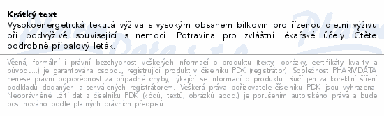 Vysokoenergetická tekutá výživa s vysokým obsahem bílkovin pro řízenou dietní výživu při podvýživě související s nemocí. Potravina pro zvláštní lékařské účely. Čtěte pozorně příbalový leták.