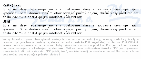 Sprej na vlasy regeneruje suché i poškozené vlasy a současně urychluje jejich vysoušení. Sprej dodává vlasům dlouhotrvající pružný objem, chrání vlasy před teplem až do 232 °C a poskytuje jim odolnost vůči vlhkosti.