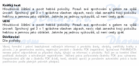 Hloubkové čištění a pocit hebké pokožky. Posuň své sprchování s gelem na vyšší úroveň. Sprchový gel 3 v 1 spláchne všechen zápach, navíc však zanechá tvoji pokožku hebkou a jemnou jako obláček. Jakmile jej jednou vyzkoušíš, už není cesty zpět.