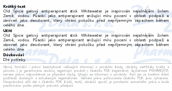 Old Spice gelový antiperspirant stick Whitewater je inspirován nejsilnějším živlem Země, vodou. Působí jako antiperspirant snižující míru pocení v oblasti podpaží a zároveň jako deodorant, který chrání pokožku před nepříjemným zápachem během celého dne.