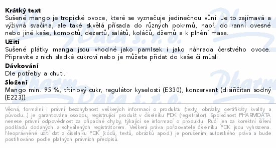 Sušené mango je tropické ovoce, které se vyznačuje jedinečnou vůní. Je to zajímavá a výživná svačina, ale také skvělá přísada do různých pokrmů, např. do ranní ovesné nebo jiné kaše, kompotů, dezertů, salátů, koláčů, džemů a k plnění masa.