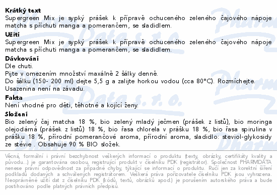 Supergreen Mix je sypký prášek k přípravě ochuceného zeleného čajového nápoje matcha s příchuti manga a pomerančem, se sladidlem.