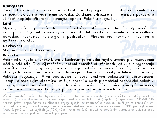 Pharmedis mýdlo s nanostříbrem a kaolinem díky výjimečnému složení pomáhá při zánětech, vyživuje a regeneruje pokožku. Zklidňuje, vyhlazuje a mineralizuje pokožku a zároveň zlepšuje přirozenou obranyschopnost. Pokožku nevysušuje.