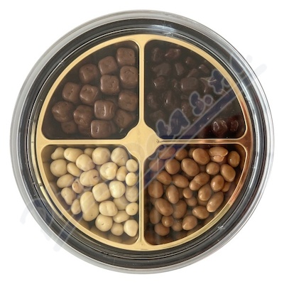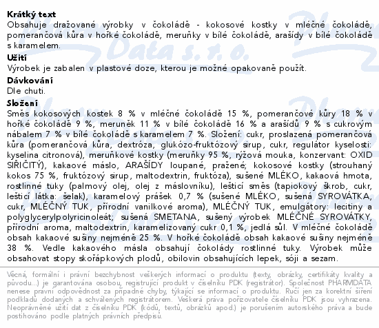 Obsahuje dražované výrobky v čokoládě - kokosové kostky v mléčné čokoládě, pomerančová kůra v hořké čokoládě, meruňky v bílé čokoládě, arašídy v bílé čokoládě s karamelem.