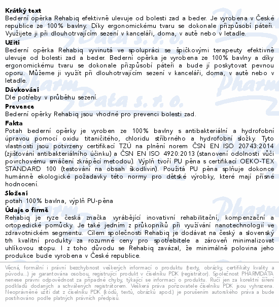 Bederní opěrka Rehabiq efektivně ulevuje od bolesti zad a beder. Je vyrobena v České republice ze 100% bavlny. Díky ergonomickému tvaru se dokonale přizpůsobí páteři. Využijete ji při dlouhotrvajícím sezení v kanceláři, doma, v autě nebo v letadle.