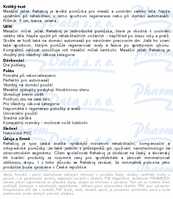 Masážní ježek Rehabiq je skvělá pomůcka pro masáž a uvolnění celého těla. Najde uplatnění při rehabilitaci, v rámci sportovní regenerace nebo při domácí automasáži. Průměr: 9 cm, barva: zelená.