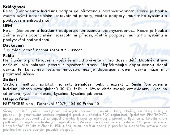 Reishi (Ganoderma lucidum) podporuje přirozenou obranyschopnost. Reishi je houba známá svými potenciálními zdravotními přínosy, včetně podpory imunitního systému a poskytování antioxidantů.