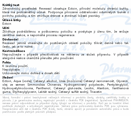 Zdravotnický prostředek Reveasol obsahuje Ectoin, přírodní molekulu chránící buňky, která má protizánětlivý účinek. Podporuje přirozené odstraňování odumřelých buněk z povrchu pokožky, a tím zmírňuje drsnost a ztvrdnutí ložisek psoriázy.