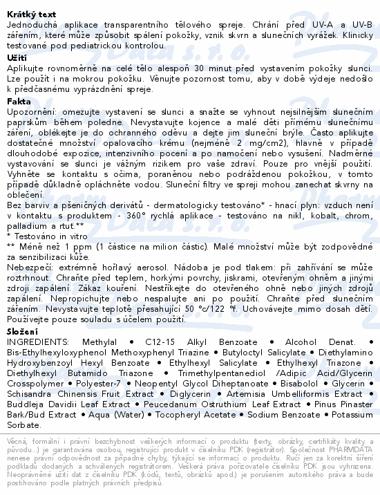 Jednoduchá aplikace transparentního tělového spreje. Chrání před UV-A a UV-B zářením, které může způsobit spálení pokožky, vznik skvrn a slunečních vyrážek. Klinicky testované pod pediatrickou kontrolou.