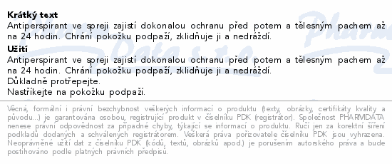 Antiperspirant ve spreji zajistí dokonalou ochranu před potem a tělesným pachem až na 24 hodin. Chrání pokožku podpaží, zklidňuje ji a nedráždí.