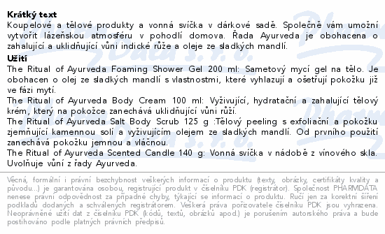 Dárkové balení obsahuje The Ritual of Ayurveda Sprchový gel 50 ml, Vyrovnávací tělový krém 70 ml, Tělový peeling 125 ml.