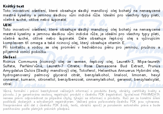 Toto inovativní ošetření, které obsahuje sladký mandlový olej bohatý na nenasycené mastné kyseliny a jemnou sladkou vůni indické růže. Ideální pro všechny typy pleti, včetně suché, citlivé nebo šupinaté.