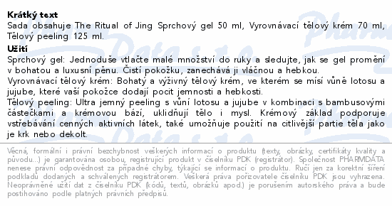 Sada obsahuje The Ritual of Jing Sprchový gel 50 ml, Vyrovnávací tělový krém 70 ml, Tělový peeling 125 ml.