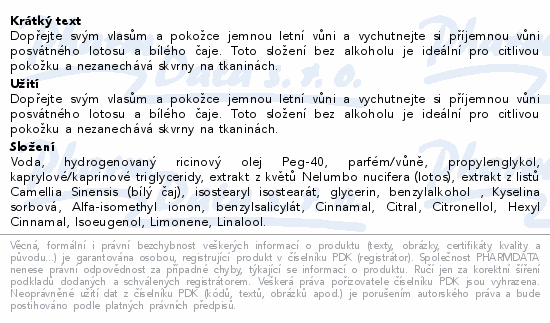 Dopřejte svým vlasům a pokožce jemnou letní vůni a vychutnejte si příjemnou vůni posvátného lotosu a bílého čaje. Toto složení bez alkoholu je ideální pro citlivou pokožku a nezanechává skvrny na tkaninách.