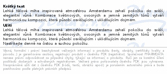 Lehká tělová mlha inspirovaná atmosférou Amsterdamu zahalí pokožku do svěží, elegantní vůně. Kombinace květinových, ovocných a jemně zemitých tónů vytváří harmonickou kompozici, která působí osvěžujícím i uklidňujícím dojmem.