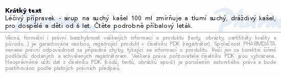 Léčivý přípravek - sirup na suchý kašel 100 ml zmírňuje a tlumí suchý, dráždivý kašel, pro dospělé a děti od 6 let. Čtěte pozorně příbalový leták.