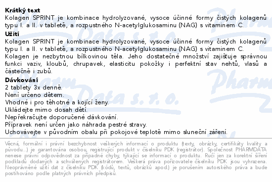 Kolagen SPRINT je kombinace hydrolyzované, vysoce účinné formy čistých kolagenů typu I. a II. v tabletě, a rozpustného N-acetylglukosaminu (NAG) s vitaminem C.
