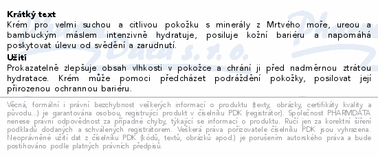 Krém pro velmi suchou a citlivou pokožku s minerály z Mrtvého moře, ureou a bambuckým máslem intenzivně hydratuje, posiluje kožní bariéru a napomáhá poskytovat úlevu od svědění a zarudnutí.