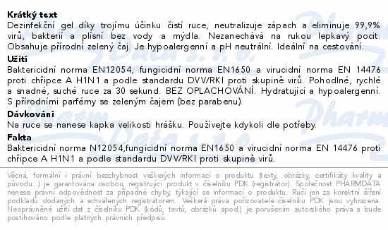 Dezinfekční gel díky trojímu účinku čistí ruce, neutralizuje zápach a eliminuje 99, 9% virů, bakterií a plísní bez vody a mýdla. Nezanechává na rukou lepkavý pocit. Obsahuje přírodní zelený čaj. Je hypoalergenní a pH neutrální. Ideální na cestování.