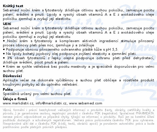 Sebamed noční krém s fytosteroly zklidňuje citlivou suchou pokožku, zamezuje pocitu pálení, svědění a pnutí. Lipidy a vysoký obsah vitaminů A a E z avokádového oleje pokožku zjemňují a zvyšují její elasticitu.