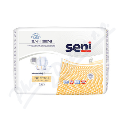 Prodyšné vložné pleny San Seni Normal se savostí 1200ml, 30ks. Upevňují se pomocí síťových kalhotek San Seni. Díky anatomickému tvaru se skvěle přizpůsobí tělu. Dvojité savé jádro pro větší pocit sucha a vnitřní boční záhyby, které zabraňují úniku moči.