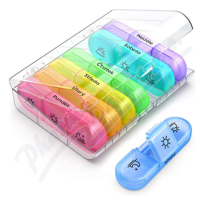 Cestovní dávkovač léků se zásuvnými boxy pro každý den v týdnu, přehledně popsaný pro snadnou orientaci. Denní dávkovač je...
