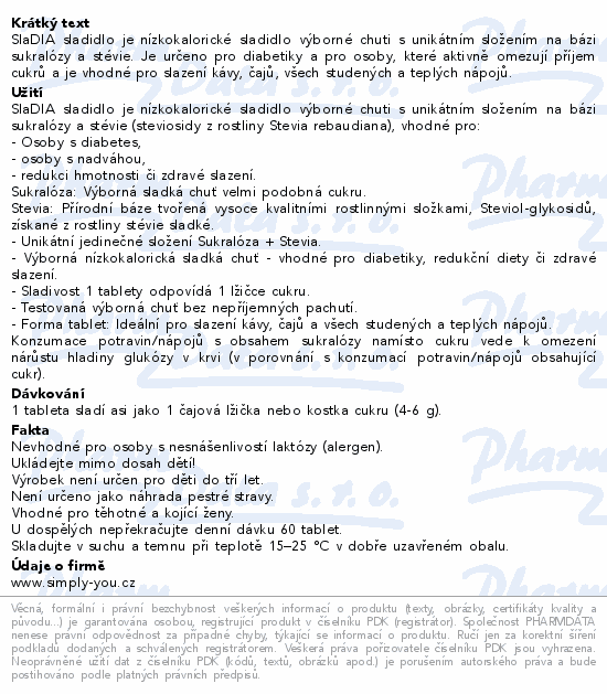 SlaDIA sladidlo je nízkokalorické sladidlo výborné chuti s unikátním složením na bázi sukralózy a stévie. Je určeno pro diabetiky a pro osoby, které aktivně omezují příjem cukrů a je vhodné pro slazení kávy, čajů, všech studených a teplých nápojů.
