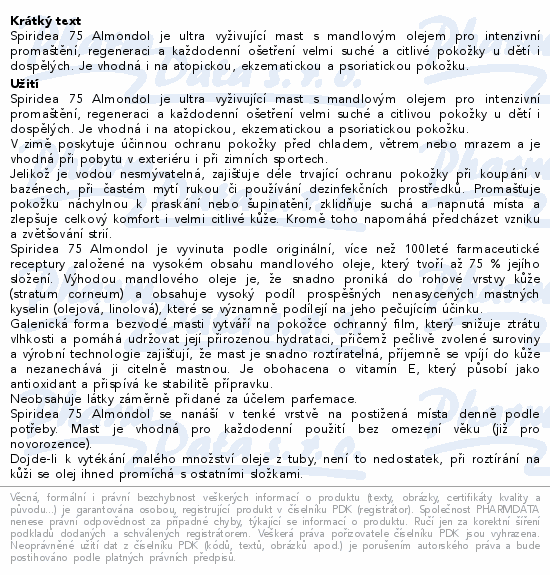 Spiridea 75 Almondol je ultra vyživující mast s mandlovým olejem pro intenzivní promaštění, regeneraci a každodenní ošetření velmi suché a citlivé pokožky u dětí i dospělých. Je vhodná i na atopickou, ekzematickou a psoriatickou pokožku.