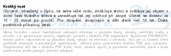 Glycerin, obsažený v čípku, na sebe váže vodu, změkčuje stolici a zvětšuje její objem v dolní části tlustého střeva a...