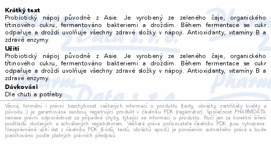 Probiotický nápoj původně z Asie. Je vyrobený ze zeleného čaje, organického třtinového cukru, fermentováno bakteriemi a...