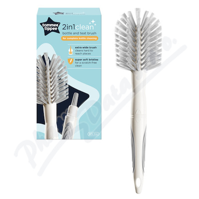 Speciálně konstruovaný kartáč Tommee Tippee 2v1 na bezpečné mytí lahví před sterilizací bez škrábanců. Nezapomeňte vždy důkladně umýt láhve a savičky ihned po krmení. Kartáč udržujte v čistotě. Štětiny příležitostně vypařte vařící vodou.