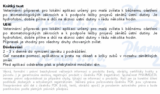 Veterinární přípravek pro lokální aplikaci určený pro malá zvířata k běžnému ošetření po stomatologických zákrocích a k podpoře léčby projevů zánětů ústní dutiny. Je hydrofobní, dobře přilne a drží na sliznici ústní dutiny v řádu několika hodin.