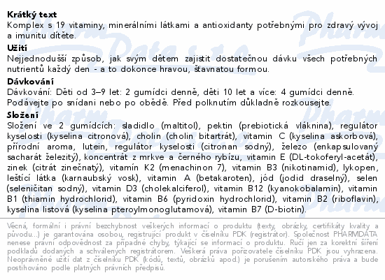 Komplex s 19 vitaminy, minerálními látkami a antioxidanty potřebnými pro zdravý vývoj a imunitu dítěte.
